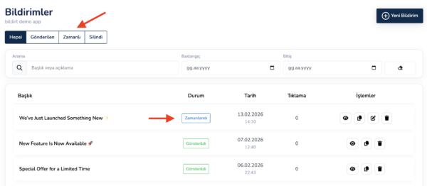 Zamanlanan bildirim, belirlediğiniz tarih ve saatte otomatik olarak gönderilir.