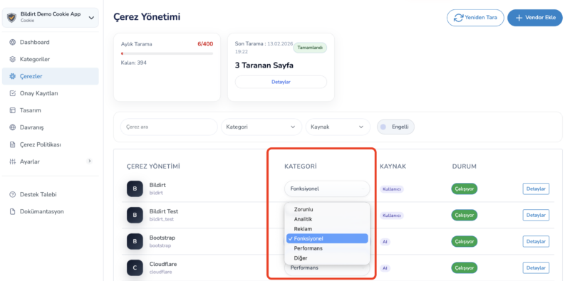 Tarama işlemi sonrasında sistem bulunan çerezleri analiz eder, türlerini belirler ve ilgili izin kategorilerine öneri olarak yerleştirir.