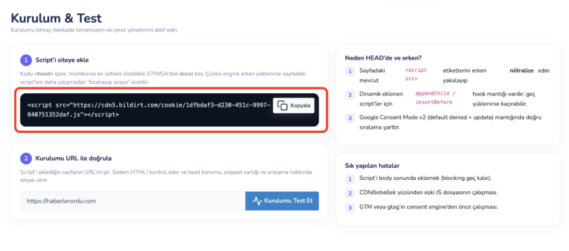Uygulama oluşturduktan sonra size özel bir kurulum script kodu üretilir.