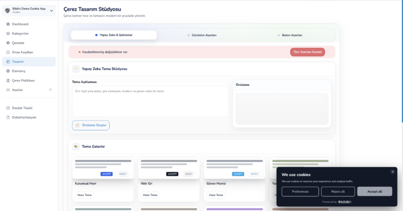 Banner, ziyaretçiye gösterilen izin alma arayüzüdür. Banner; alt bar, popup, tam ekran veya minimal mod gibi farklı biçimlerde tasarlanabilir. Renkler, buton yapısı ve metinler özelleştirilebilir.