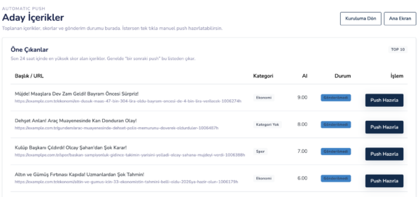 Her içerik için Push Hazırla butonuna tıklayarak,