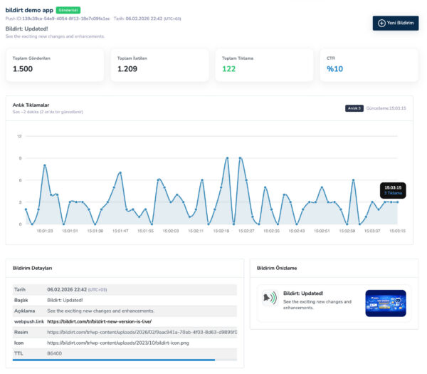 Bildirt’in performans ve analitik ekranları, push bildirimlerinizin